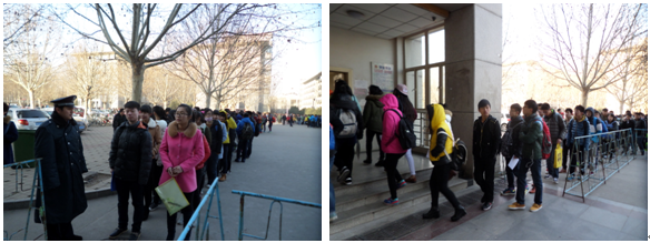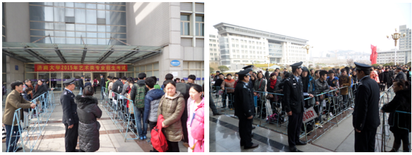 yl23455永利集团2015年艺术类专业考试于2月27日至3月4日在中心校区第十教学楼进行。安全管理处承担考试现场秩序维护和校园及周边交通疏导管控等工作。根据今年考生人数多、考试项目多、考试时间长的特点,加强对考点现场的安全保卫和校园周边送接考生车辆的指引疏导及校园交通管控,确保考场内外井然有序和校园道路畅通。队员们不畏天寒,克服疲劳,坚守岗位,连续作战,每天从早6:30分上岗,到晚11点结束。连续奋战5天,共执勤240余人次,疏导车辆3000多辆次。在全体保卫人员的共同努力下,确保了今年艺术类招生考试的安全顺利进行,圆满完成艺术类招生考试安保工作,得到各级领导的一致好评。