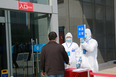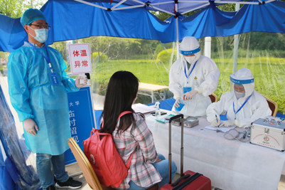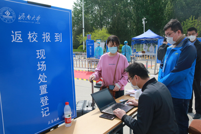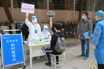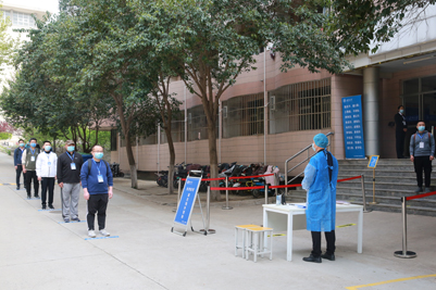 在各个场景的应急处置演练中,安全管理组工作人员负责秩序维护,并适时提醒学生佩戴口罩、有序排队,按规定保持间隔距离;健康监测组工作人员逐一检测学生体温,发现有学生体温异常时,工作人员立即引导其前往临时留观点等候,由留观转诊组重测体温,确认体温异常时,启动应急处置,校区负责人通知综合协调、学生管理、安全保卫和后勤服务等专项工作组人员到达现场,布设警戒线、彻底消毒等相关工作。在学生返校进入校园的检测查验演练场景中,学校制作了健康通行码,体温正常的学生,在返校报到系统输入个人正常体温,进行扫码确认后,由学生管理组工作人员核验其校园卡、返校通行码、健康通行卡,合格后进入校园。证件核验不合格的学生,由学生管理组负责安排工作人员带离处理。报到期间,发现有未按时报到的学生,学生管理组负责组织辅导员及时电话联系,并根据具体情况采取相应措施。在食堂送餐演练场景中,食堂供餐人员按照学生定餐清单,按学生公寓楼号分楼层装好餐盒,并填制交接记录单。食堂供餐人员按学生公寓楼别送餐、交接餐、收回餐盒,核对并填写交接记录单;食堂按照规定做好餐盒消毒等工作。在图书馆应急处置演练场景中,学生一人一桌,自感不适时,即刻报告辅导员,辅导员引导学生至临时留观点等候,确认体温异常后,启动应急处置,并报告校区负责人。