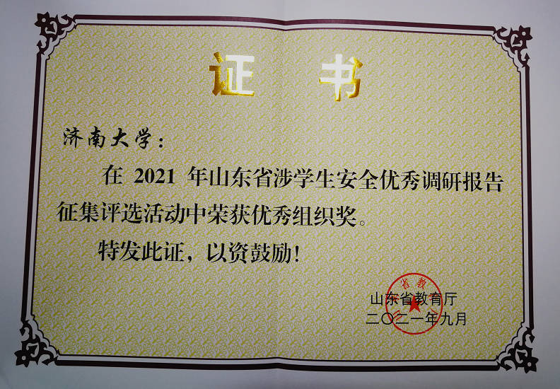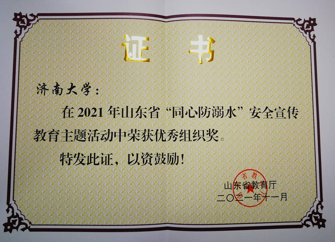 近日,山东省教育厅等7 部门开展了“同心防溺水”安全宣传教育主题活动,山东省高等学校安全保卫协会组织了2021年山东省涉学生安全优秀调研报告征集评选活动活动,经过精心组织,我校相关部门单位踊跃报名参赛,取得可喜成绩,学校两项活动均荣获优秀组织单位奖。其中,孟德洋、史国普、李素洁、陈恺盛、郜佳慧、尹鑫、赵丽丽、黄嘉鑫八名同志分别荣获2021年山东省涉学生安全优秀研究成果奖;石卫华、薛慧君撰写的《关于做好高校大型活动安保前期准备工作的思考》、段继燕、陈恺盛撰写的《高校突发事件网络舆情的区域管理机制探究》、陈恺盛、段继燕撰写的《高校学生群体性突发事件的科学预防与处置》三篇论文分别荣获优秀成果三等奖。