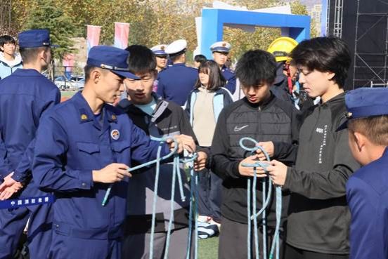 在消防技能体验区,欢声笑语不断。同学们化身“消防员”,整装集结,体验消防员的日常训练。大家围着消防员认真学习打绳结的技巧,挑战用液压扩张钳精准夹取乒乓球。在消防员的指导下,同学们还兴奋地体验了射水打靶,强劲的水压给他们带来了既兴奋又新奇的感受。
