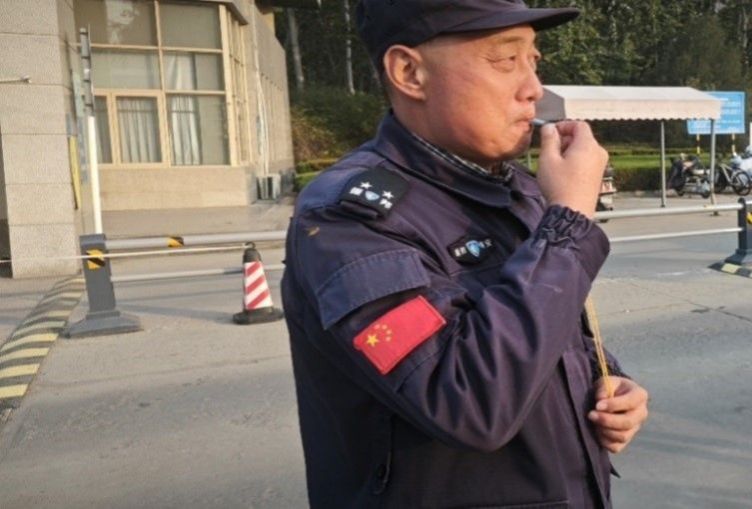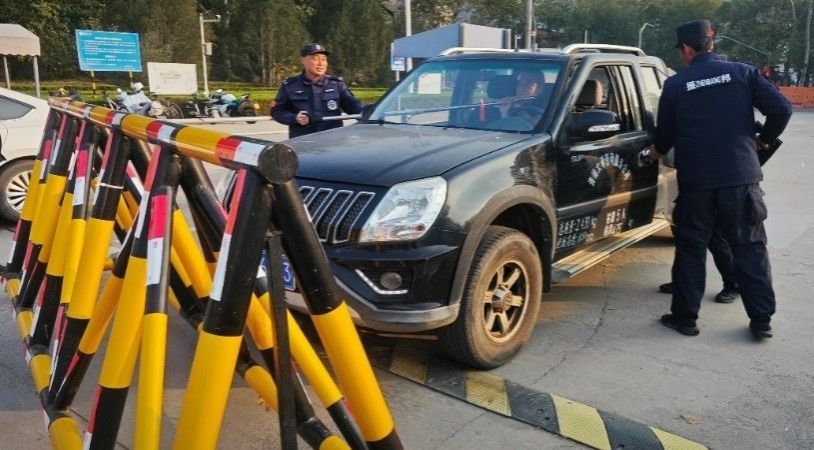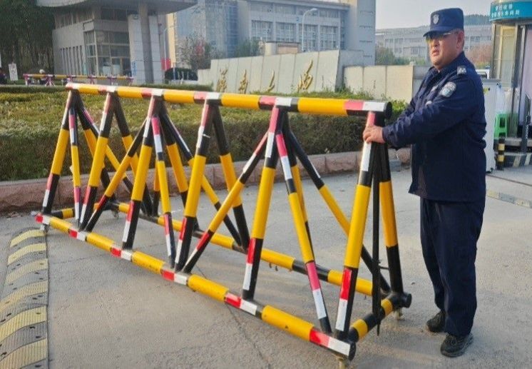 演练开始前,准备工作有序完成。在学校东南门合适位置,拒马、破胎器、警棍、叉子等防冲撞器械摆放整齐,模拟冲撞车辆也已准备妥当。参演的 4 名保安人员精神抖擞,严阵以待。当模拟失控车辆冲向学校东南门这一紧急情况出现时,靠近路边的保安迅速吹响哨子,尖锐的警报声划破长空,同时他通过对讲机将情况告知其他保安。随即,两名保安迅速行动,合力将拒马推至道路中央,阻挡车辆前行,减缓其速度。车辆继续逼近,一名保安在车辆必经路线放置破胎器。而另一名保安则迅速在后方疏散周边学生,指引他们向安全区域撤离,确保学生远离危险。