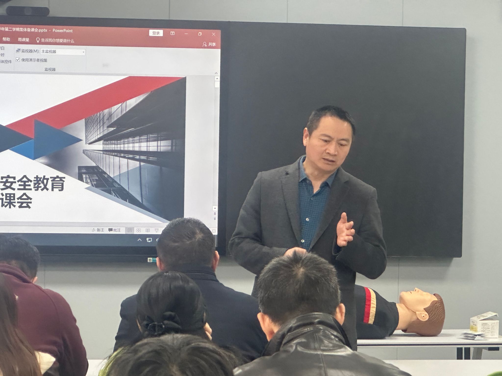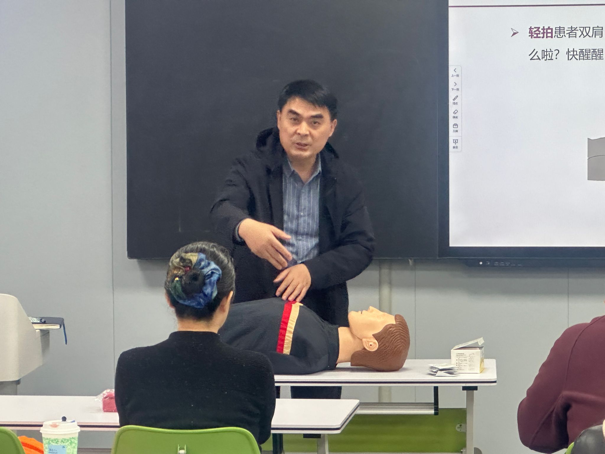 校医院副院长王鲁奎以“如何上好大学生安全教育实践课”为题进行示范教学。他结合大学生安全教育实践内容,重点讲解了心肺复苏术的操作要点,强调“黄金四分钟”的重要性,并通过模拟人演示了胸外按压、人工呼吸等标准动作。王鲁奎强调,实践课程应注重提升学生的互动性和体验感,通过采用'理论讲解+分组实操+考核认证'的教学模式,确保学生能够熟练掌握急救技能。