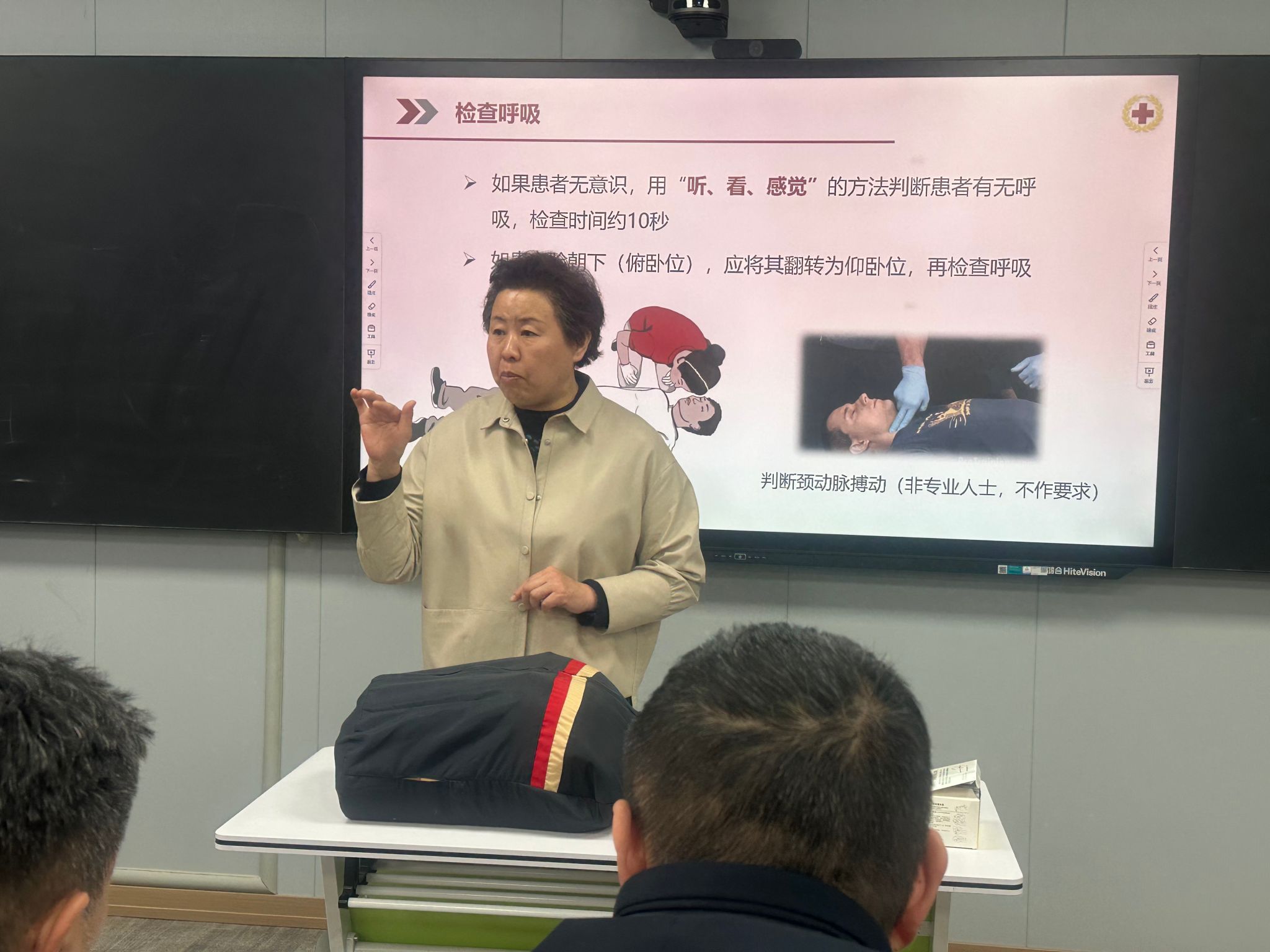随后,市中区红十字会刘蓉科长进行了专业点评,她结合《应急救护服务平台使用流程》强调,教学中需规范操作细节,如AED电极片贴放位置、止血带使用时限等,并建议通过“情景模拟+案例分析”增强教学实效性。