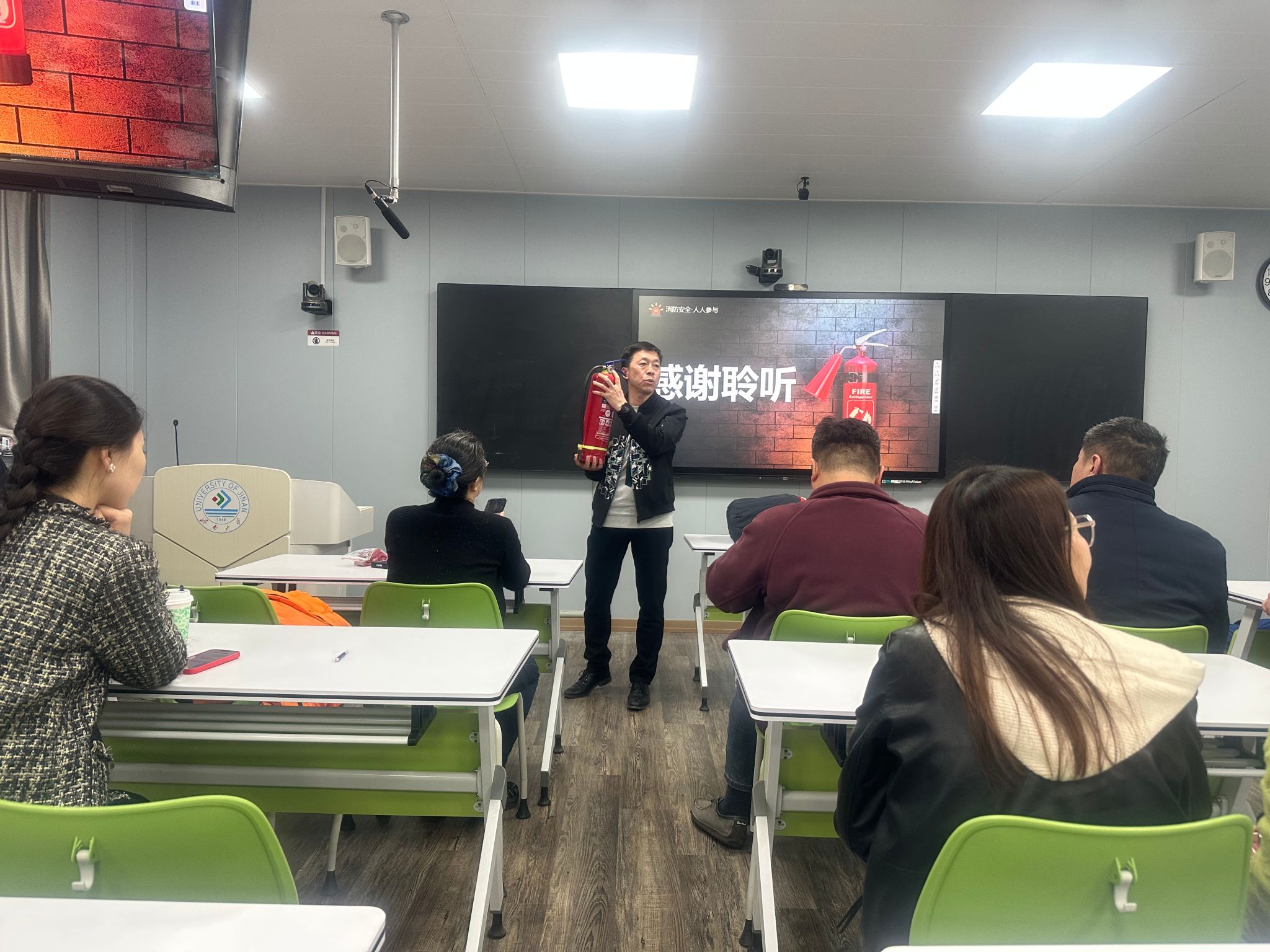 消防管理科科长陈军系统讲解了消火栓、手动报警按钮、感烟探测器等消防设施的识别与使用方法并通过“连接水带-打开阀门-对准火源根部灭火”的消火栓操作演示,强调“三同时”原则(报警、灭火、逃生同步进行),并提醒师生注意疏散标识、应急灯等设施的日常维护。