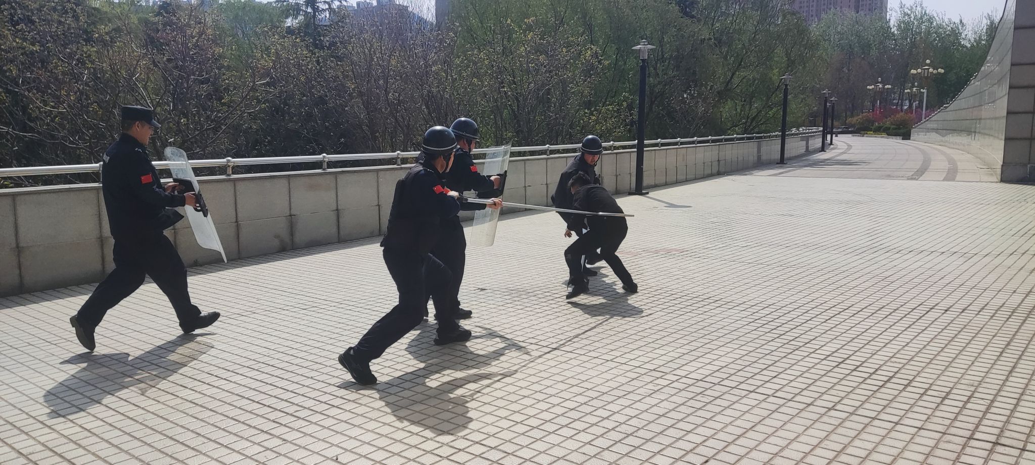 此次演练备受领导重视,安全管理处臧甲友副处长与石卫华副处长全程深度参与,全方位指导演练工作,切实履行安全责任。演练模拟了一名暴徒强行闯入校园的紧急突发状况,学校安保人员迅速反应,即刻按照既定应急预案,有条不紊地开展 “二对一”“三对一” 等最小应急单元的处置行动。