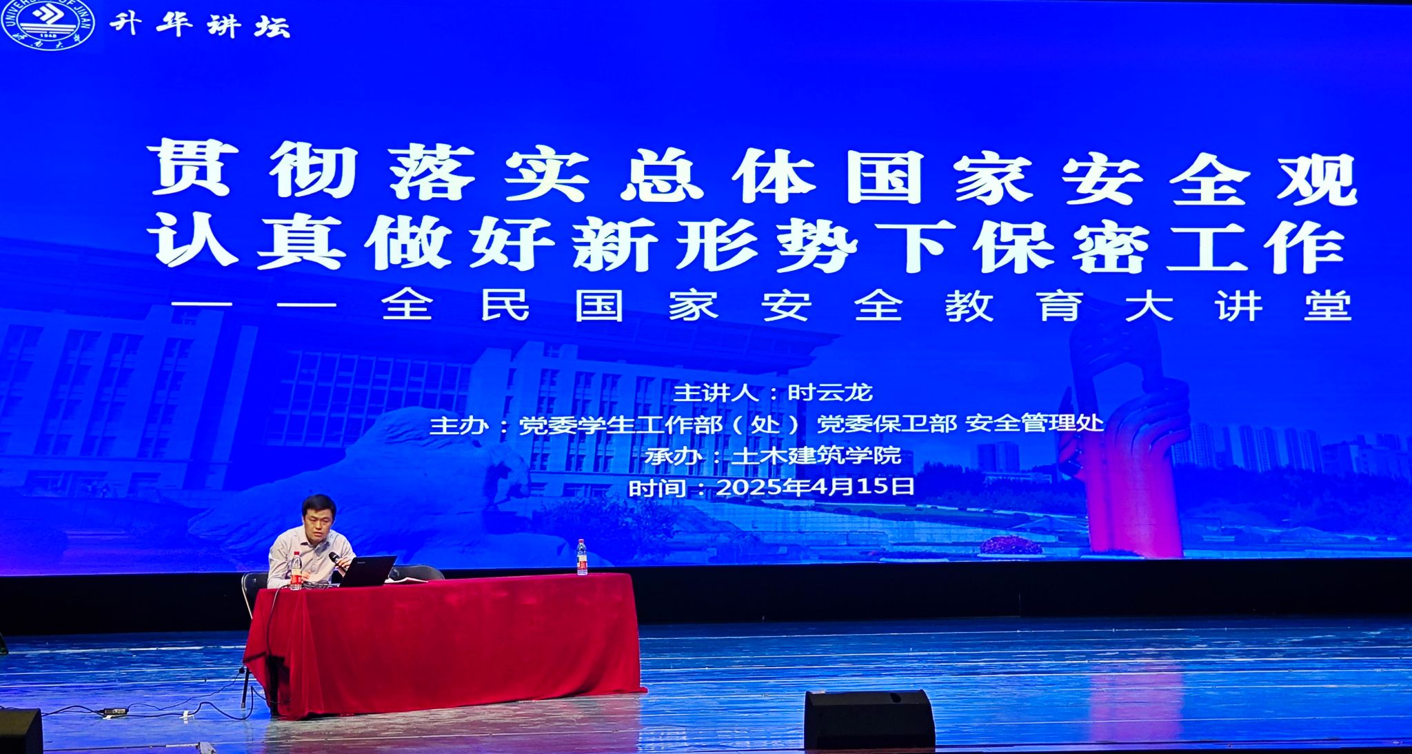 为深入贯彻落实习近平总书记关于国家安全和保密工作的重要论述,学习总体国家安全观,加强全民国家安全教育,筑牢校园安全思想防线,4月15日,由党委学生工作部(处)、党委保卫部 安全管理处 主办,土木建筑学院承办的升华讲坛-全民国家安全教育大讲堂在学校大礼堂举行。济南市委机要保密局技术中心业务二室副主任时云龙受邀作专题授课。党委保卫部 安全管理处 部(处)长李荣光主持活动,各单位涉密人员、各学院学生代表及土木建筑学院全体师生参加了活动。