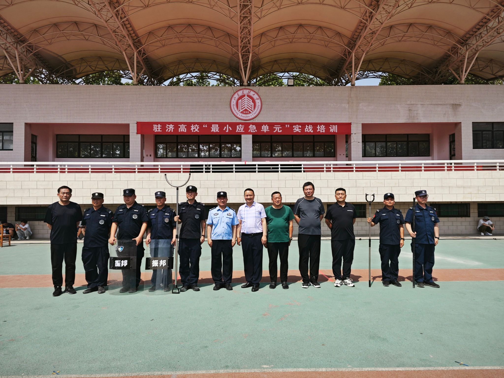 5 月 21 日,学校安全管理处组织安全管理干部、安保队员10余人参加由济南市公安局主办的驻济高校 “最小应急单元” 实战培训。山东省教育厅二级巡视员李文生,济南市公安局局领导、二级警务专员刘西茂等领导到场指导培训。