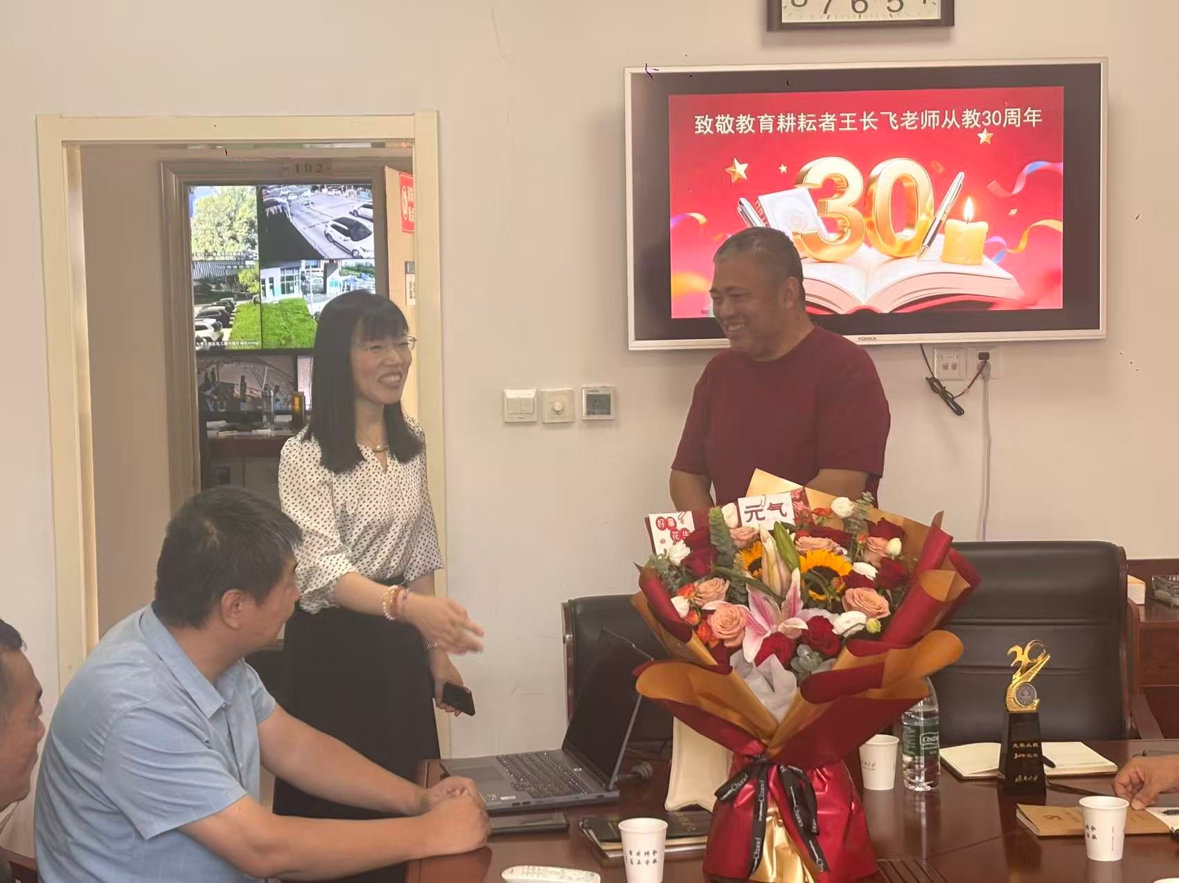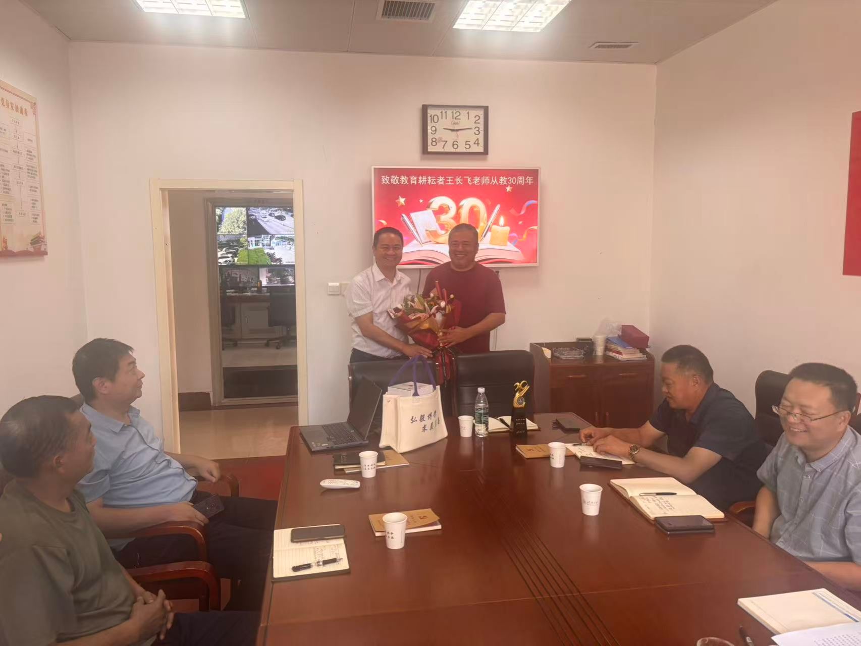 9月9日,在第41个教师节来临之际,安全管理处隆重举行了王长飞老师从教30周年表彰座谈会,以此向长期耕耘在教育一线、为校园安全事业作出杰出贡献的王长飞老师表达敬意与感谢。学校机关党委书记刘芝、副书记杨立洁、机关党委一分会工会主席石卫华等领导莅临慰问,与安全管理处全体职工共同见证了这一温馨而庄重的时刻。