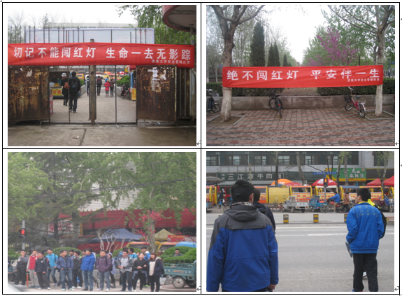 为有效增强师生员工交通安全意识,消除“闯红灯”行为造成的安全隐患。4月2日,安全管理处交通技防科在主校区南院北门和北院老南门等校园周边“红绿灯”路口,精心设计和悬挂了以“不闯红灯 文明交通”为主题的标语横幅,并对“闯红灯”行为进行了劝止,成效明显。
