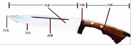 1.匕首:带有刀柄、刀格和血槽,刀尖角度小于60度的单刃、双刃或多刃尖刀(见图一)。